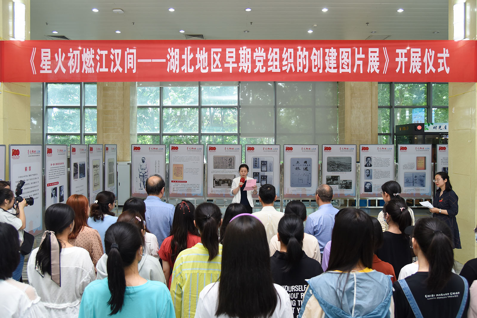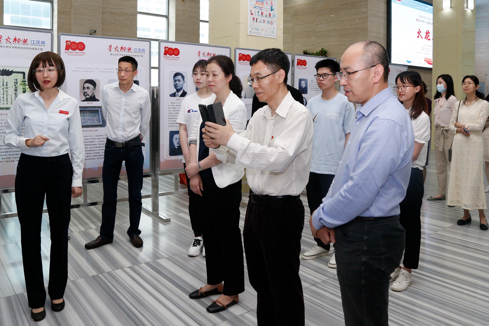 星火初燃,开天辟地。为庆祝中国共产党成立100周年、迎接2021年5·18国际博物馆日,5月14日,八七会议会址纪念馆与我校博物馆联合精心打造的专题图片展“星火初燃江汉间——湖北地区早期党组织创建图片展”在我校图书馆开展。