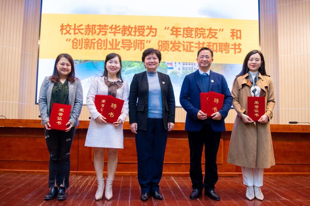 启动仪式上,郝芳华为来到现场的唐玉文、郭静、李娟、刘洁4位外国语学院2019-2020“年度院友”代表颁发表彰证书;为唐玉文、郭静2位外国语学院“创新创业导师”代表颁发聘书。