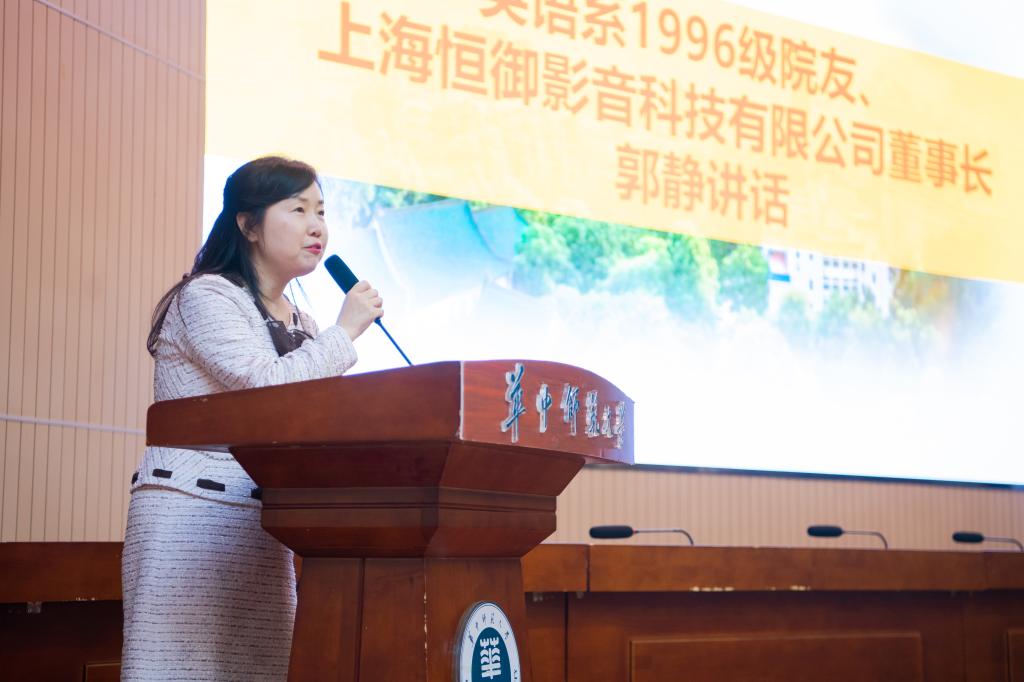 院友代表、英语系1996级院友、上海恒御影音科技有限公司董事长郭静在发言中表达了自己对母校培养的感恩之情,希望能为母校和母院发展贡献一己之力,鼓励外院学子勇敢创新、积极进取。