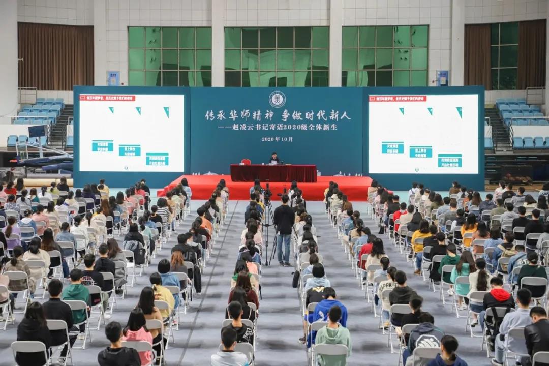 华大在线讯(通讯员 毛军刚 孙小靓)“‘我来华师做什么,如何度过大学四年,书写自己最美好的桂子山人生华章?’这们每位大学新生的‘人生之问’,也是我作为大家的老学长今天同大家谈心的话题。”10月18日晚,校党委书记赵凌云面向2020级全体新生,采取线下讲授、线上直播相结合的方式,在佑铭体育馆开讲第一堂思想政治理论课,累计吸引近万人点击观看。