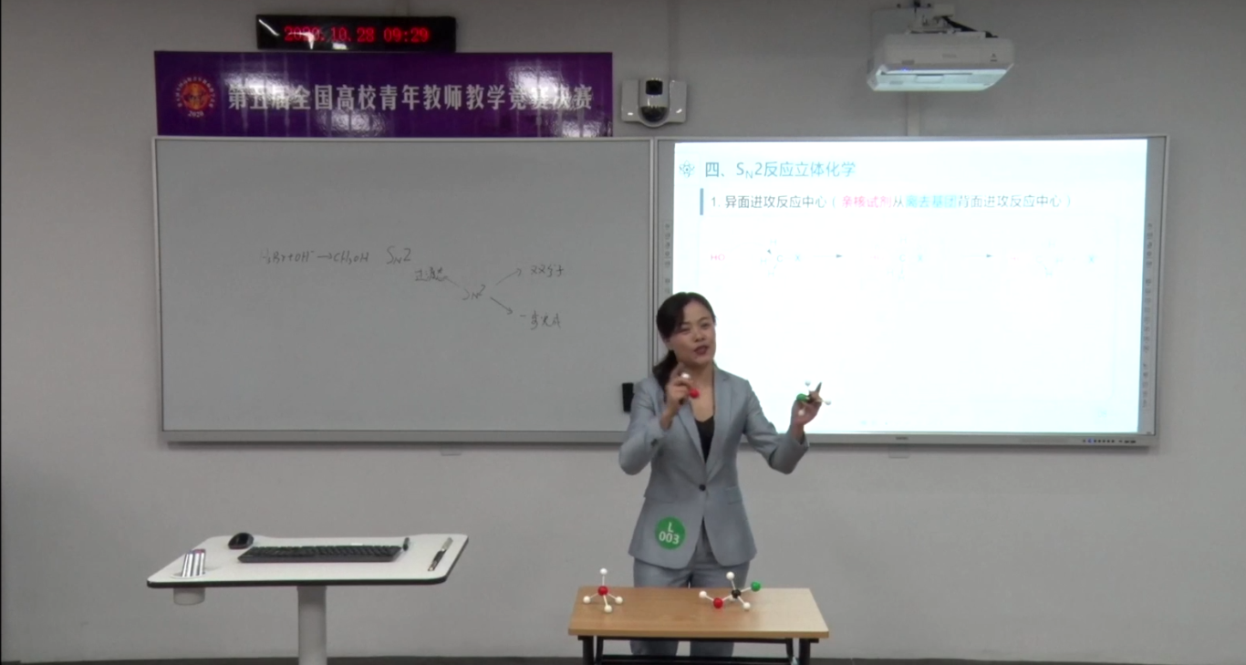 10月28日上午,佘能芳作为三号选手走上竞赛讲台。从游泳运动员傅园慧“洪荒之力”的例子引入,佘能芳以“双分子亲核取代反应”课程节段的基础知识为根本,紧密联系社会生活实际和学术前沿理念,于细节处渗透思政元素,最终得到了评委的一致认可。