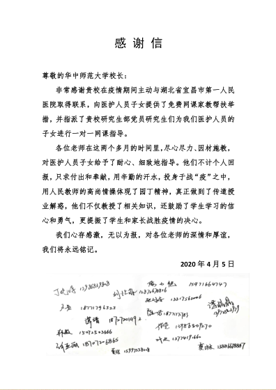 华大在线讯(通讯员 曹宇 许家瑞)日前,一封来自宜昌市第一人民医院14位医务人员的联名感谢信寄到了学校。信中写道:“尊敬的华中师范大学校长,非常感谢贵校在疫情期间主动与湖北省宜昌市第一人民医院取得联系,向医护人员子女提供了免费网课家教帮扶举措,并指派了贵校研究生部党员研究生们为我们医护人员的子女进行‘一对一’网课指导。各位老师在这两个多月的时间里,尽心尽力、因材施教,对医护人员子女给予了耐心、细致地指导。他们不计个人回报,只求付出和奉献,用辛勤的汗水,投身于战‘疫’之中,用人民教师的高尚情操体现了园丁精神,真正做到了传道授业解惑,他们不仅教授了相关知识,还鼓励了学生学习的信心和勇气,更提振了学生和家长战胜疫情的决心。我们心存感激,无以为报,对各位老师的深情和厚谊,我们将永远铭记。”