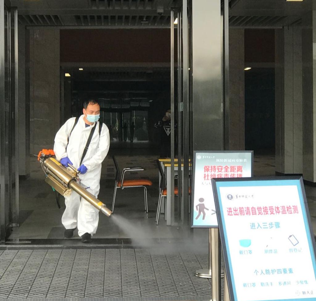 后勤保障部物业管理中心对出人员进行登记、测温,每天复试结束后,对各复试场所清洁消杀