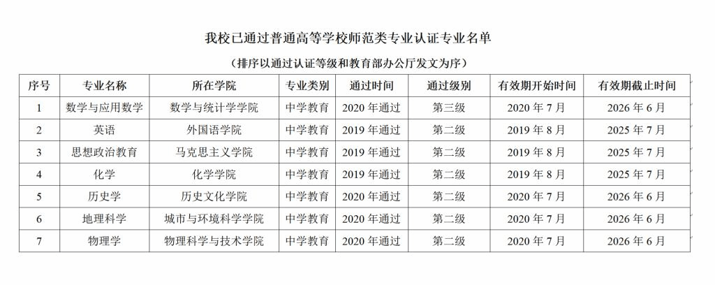 华大在线讯(通讯员 朱强 胡中波)近日,教育部办公厅发文公布2020年通过普通高等学校师范类专业认证的专业名单,我校数学与应用数学、历史学、地理科学、物理学专业通过普通高等学校师范类专业认证。其中,数学与应用数学专业通过卓越级认证,是我校第一个通过最高级(第三级)的师范类专业,也是全国首个通过最高级(第三级)的数学类师范类专业。历史学、地理科学、物理学专业通过第二级认证。根据教育部文件,认证结论有效期六年,自2020年7月起至2026年6月止。