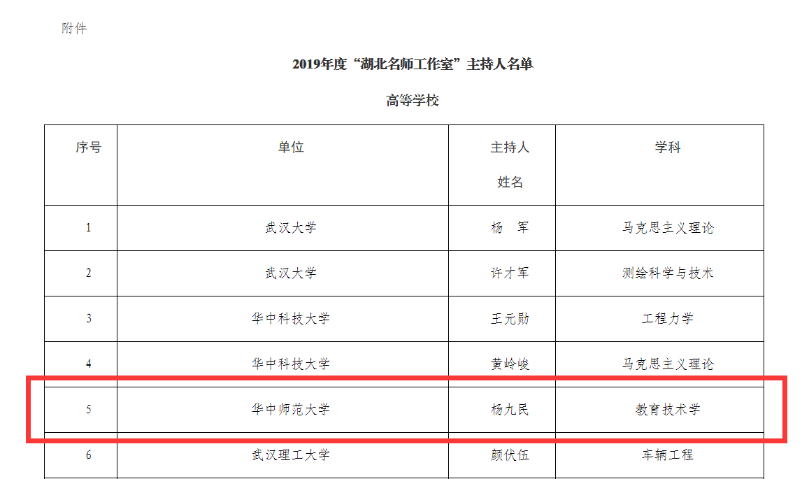 华大在线讯(通讯员 孔庆鹏)近日,湖北省教育厅公布了2019年度“湖北名师工作室”主持人名单,人工智能教育学部教育信息技术学院杨九民教授获评教育技术学学科“湖北名师工作室”主持人,同时被授予“湖北名师”称号。