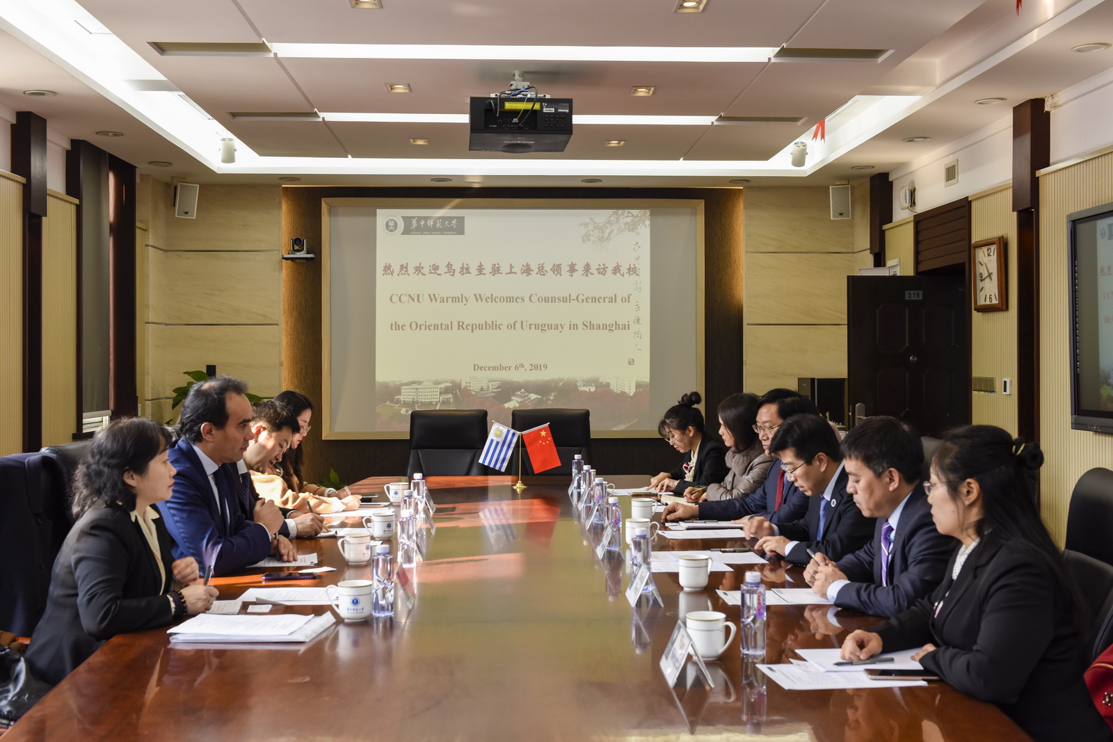 华大在线讯(通讯员 王盛夏)12月6日,乌拉圭驻上海总领事莱昂纳多.奥利维拉.安德里亚(Leonardo Olivera D’Andrea)先生、湖北省委外办美大处处长胡健一行4人访问我校。副校长彭双阶会见了代表团一行,国际合作与交流处、外国语学院及国际文化交流学院相关负责人参加会见。