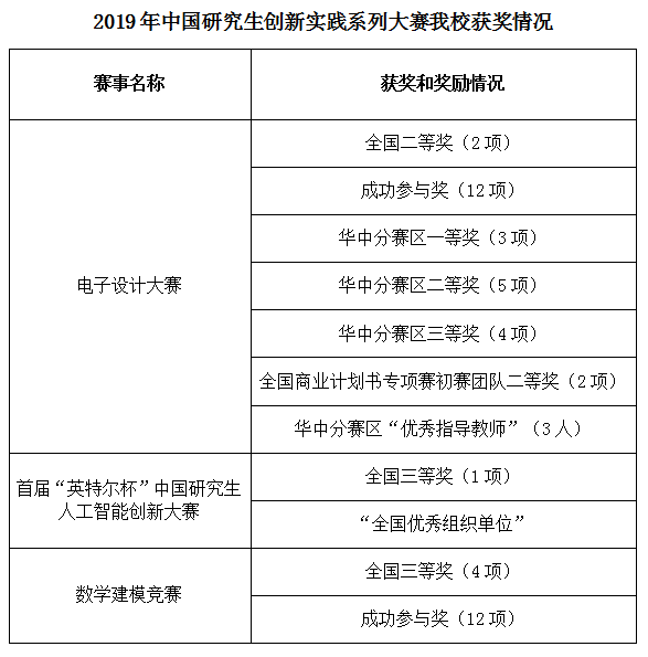 华大在线讯(通讯员 刘卫)近日,我校在2019年中国研究生创新实践系列大赛之首届“英特尔杯”中国研究生人工智能创新大赛、中国研究生数学建模竞赛和电子设计大赛等全国总决赛中喜获佳绩,荣获包括全国二等奖2项、全国三等奖5项、“成功参与奖”24项、“全国商业计划书专项赛初赛团队”二等奖2项;华中地区分赛区一等奖3项、二等奖5项、三等奖4项;物理科学与技术学院刘守印教授、黄光明教授和姚远副教授获“华中分赛区优秀指导教师”称号;我校被授予“中国研究生创新实践系列大赛优秀组织单位”。