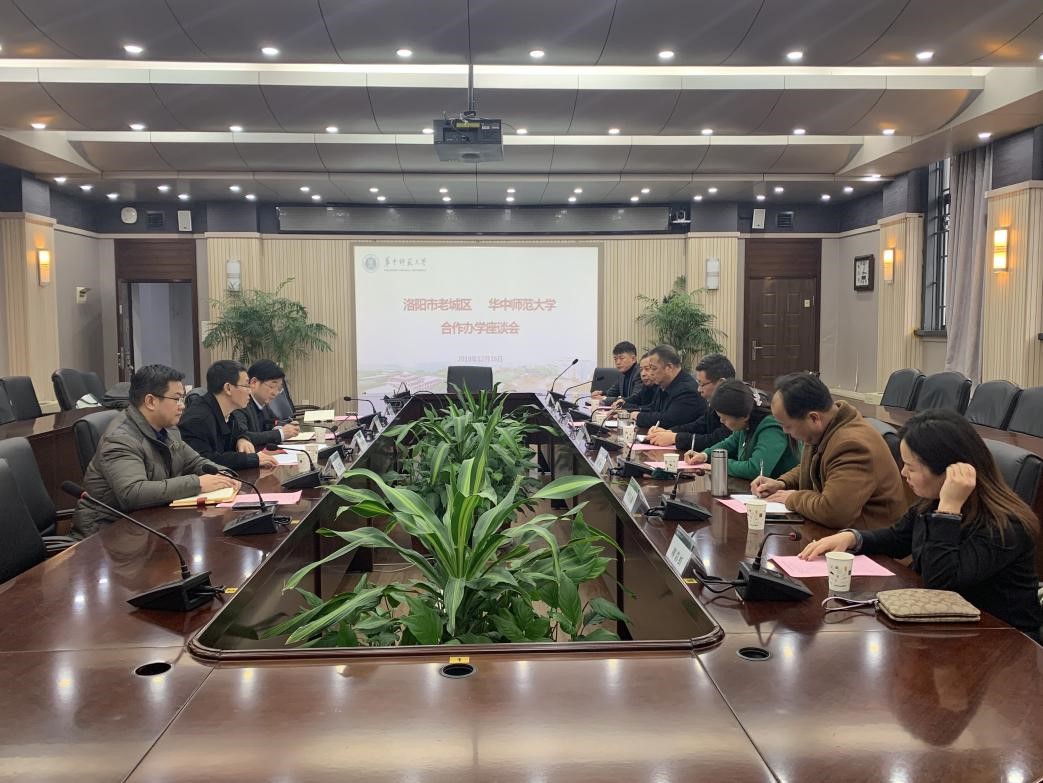 华大在线讯(通讯员 翟煜林)12月16日,洛阳市老城区与华中师范大学合作办学座谈会在行政楼一楼会议室举行。洛阳市老城区区委副书记李安民,副区长赵丽,教育体育局党组书记、局长徐万堂,副局长史银圈,洛阳彩虹教育集团创始人、洛阳市虹华科技公司董事长刘华龙,董事柳彩虹、尹凌智以及我校副校长李鸿飞、合作办负责人等出席座谈会。