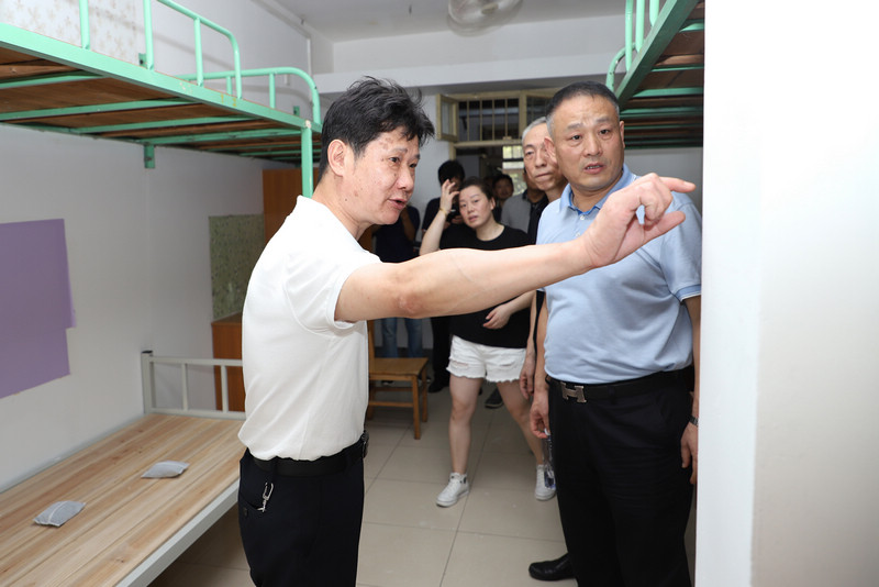 我校东区7栋、元宝山2栋学生宿舍及附属小学在暑期改造升级,赵凌云在这两栋宿舍查看了寝室改造状况,要求在八月中下旬之前完成寝室布置的各项收尾工作。赵凌云到附属小学工地询问了施工进度,提醒工人们合理安排施工时间,炎热午间注意休息。在学校北门,赵凌云慰问了在烈日下执勤的安保人员。在学子餐厅,赵凌云检查了食物准备的操作间,询问了暑期饮食的保障情况。