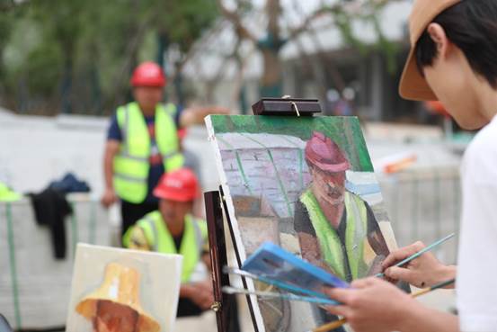 美院学子王锦珏表示自己是第一次来到建筑工地写生创作,奋斗在一线的劳动者带给他的震撼十分强烈,通过参与本次活动,他也体会到了“艺术来源于生活”。