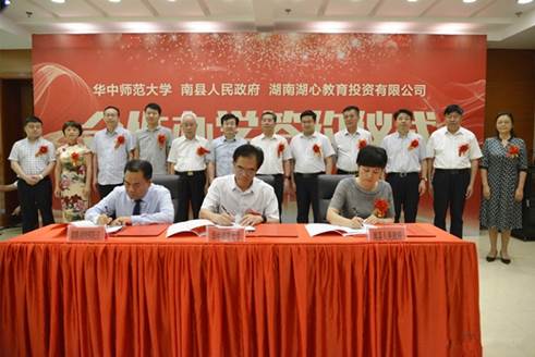 华大在线讯(通讯员 翟煜林)5月28日,我校与南县人民政府、湖南湖心教育投资有限公司举行合作办学签约仪式。县委副书记詹再德,县人大常委会主任刘安乐,湖南湖心教育投资有限公司董事长张维厂,我校副校长蔡红生,南县各单位负责人及我校合作办负责人出席签约仪式。
