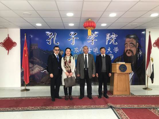 12月27日,代表团访问了苏伊士运河大学。苏大副校长阿提付•阿簿•努尔教授、苏伊士运河大学语言学院兼孔子学院哈桑院长等热情接待了代表团,并就两校合作交流进行深入协商。阿提付副校长提议双方可在教师交流、学生交换、“一带一路”相关问题研究等项目进行合作,并提议由苏大提供教师,在我校设立阿拉伯语专业。他计划于2019年4月回访我校,正式签署两校合作协议。覃红表示欢迎苏大师生来我校交流访问,力争促成两校在人文社科领域开展联合研究。