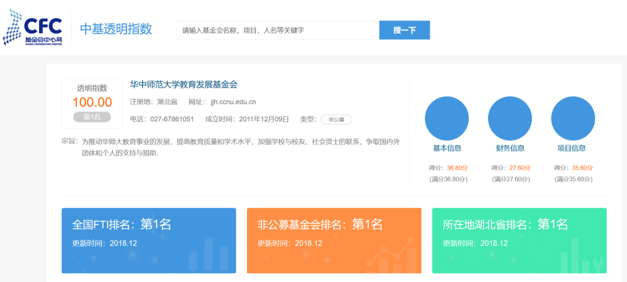 华大在线讯(通讯员 孙海婷)近日,基金会中心网(CFC)权威发布2018年度“中基透明指数FTI”排名,华中师范大学教育发展基金会“中基透明指数FTI”获得满分100分,排名全国第一(并列)。