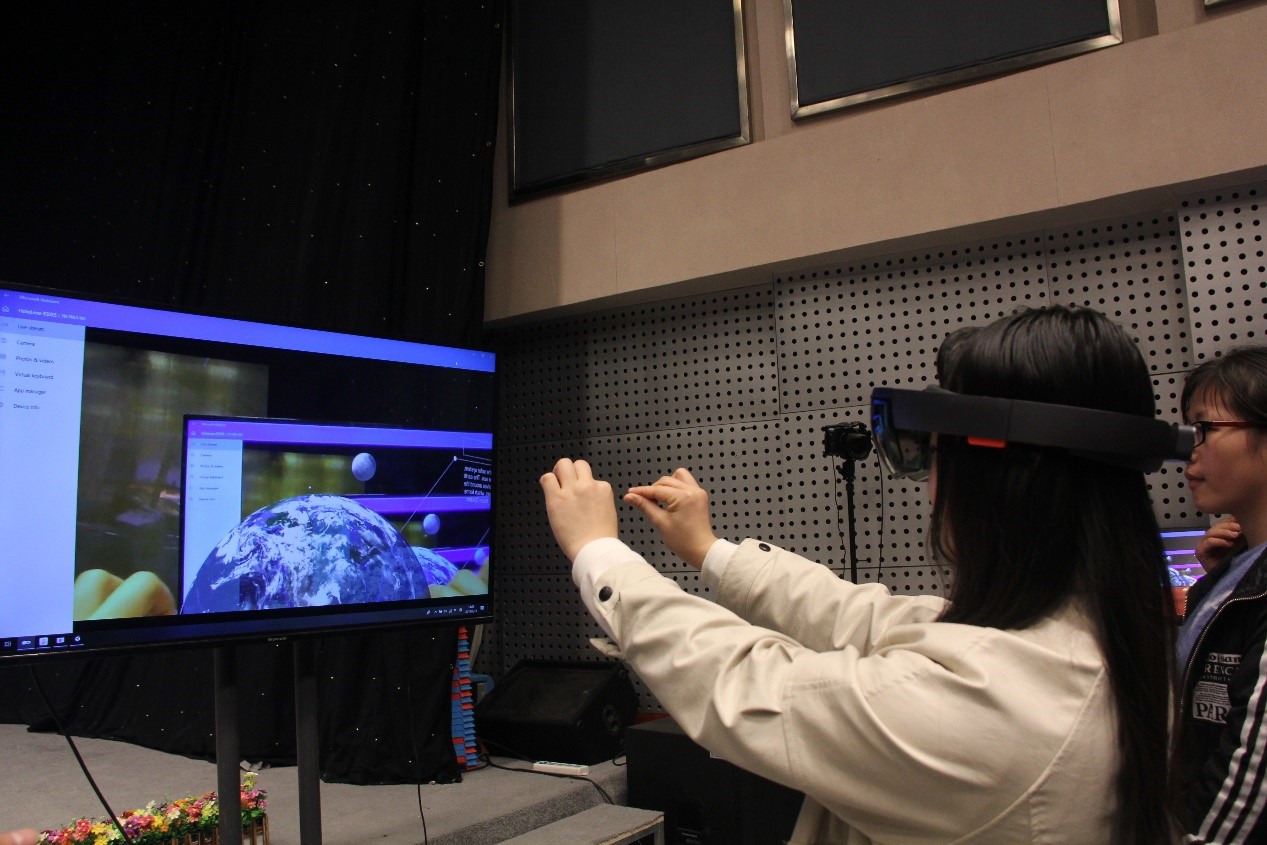 现场进行了混合现实技术互动体验,向在场观众展出党建展厅,展示了红军长征路、过雪山的虚拟场景,并邀请了几名现场观众戴上MR眼镜,亲身体验混合现实技术开发出来的游戏,更加真切的感受虚拟现实技术的魅力。