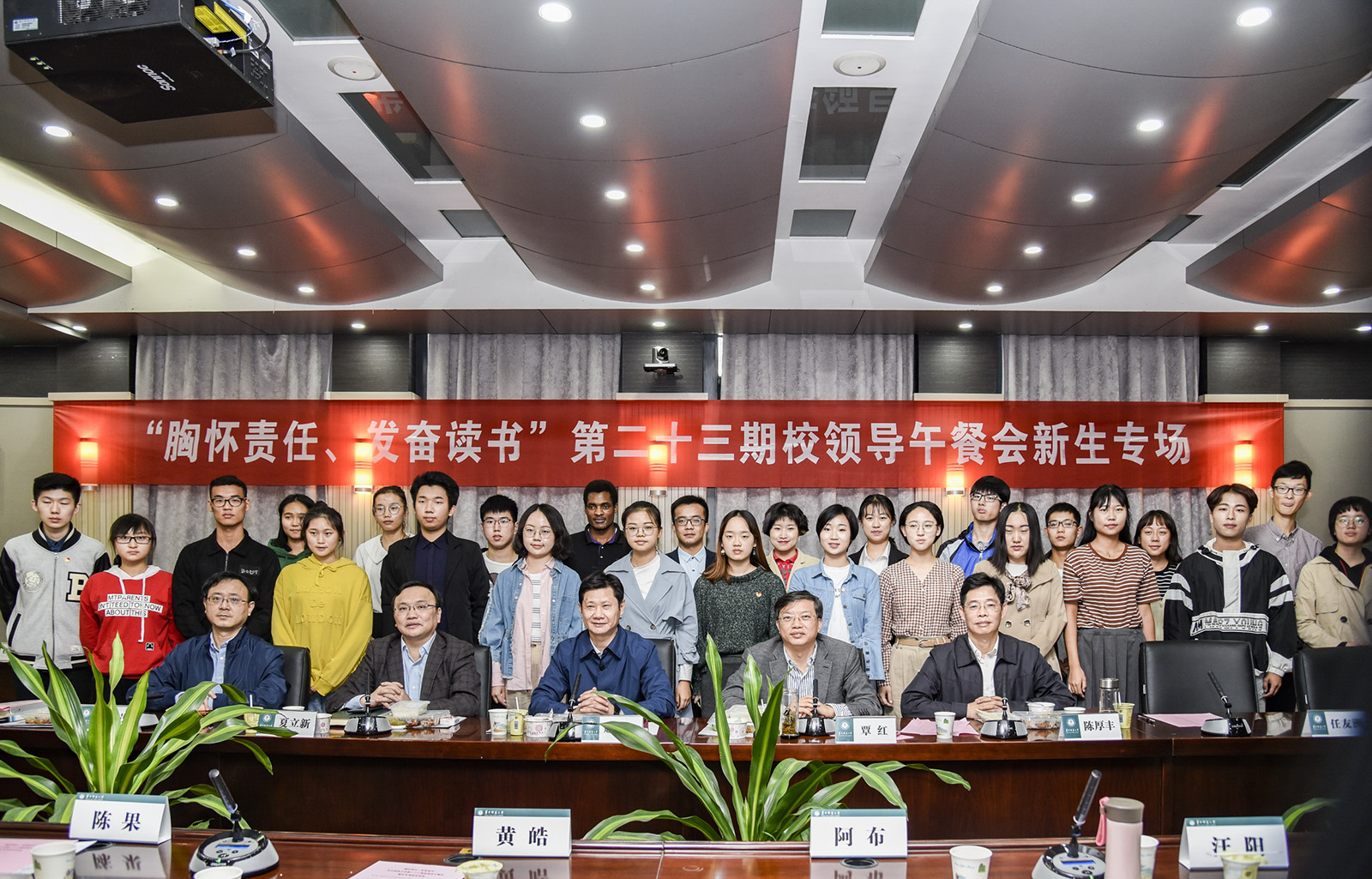 华大在线讯(记者 郝雅馨 见习记者 周凯月 蔡伟玲)为深入贯彻落实全国教育大会精神,推进“四个回归”,10月30日,以“胸怀责任,发奋读书”为主题的第二十三期校领导午餐会新生专场在行政楼一楼会议室举行。校领导赵凌云、覃红、夏立新、陈厚丰,校长助理林更茂以及党委宣传部、学工部、保卫处、后勤保障部、信息化办公室、图书馆等多个职能部门负责人与21名来自各个学院的新生共进午餐。新生们与校领导畅聊了入学两个月以来所学所感。午餐会由覃红主持。