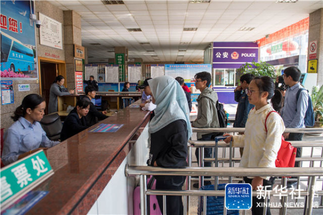 ↑仇文飞在云南省曲靖市会泽县客运站排队购买去昆明的车票(8月30日摄)。新华社记者 胡超 摄
