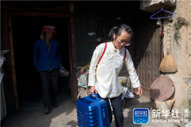 ↑在云南省曲靖市会泽县,仇文飞拎着行李箱走出家门(8月29日摄)。新华社记者 胡超 摄
