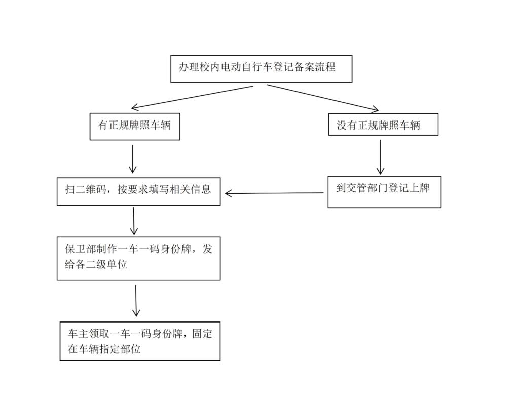 答:学校将发布电动自行车登记备案二维码,有正规牌照的车主扫码并填写相关信息即可完成登记。校保卫部将制作一车一码身份牌,配合各二级单位下发给车主,固定在车辆指定部位方便识别。具体流程如图所示: