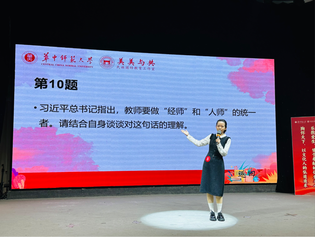 经各学院推荐,来自11个学院、涵盖9个民族的21名师范生参加初赛现场讲课环节,其中10名选手进入决赛。决赛分为自我介绍与即兴答辩、粉笔字展示、才艺展示三个环节。江汉大学马克思主义学院党委书记吕洪雁、我校国家语言文字推广基地负责人汪国胜、教师教育学院副院长薛平军、文学院副教授毛德胜、华中师范大学附属小学党支部书记唐从义应邀担任评委。