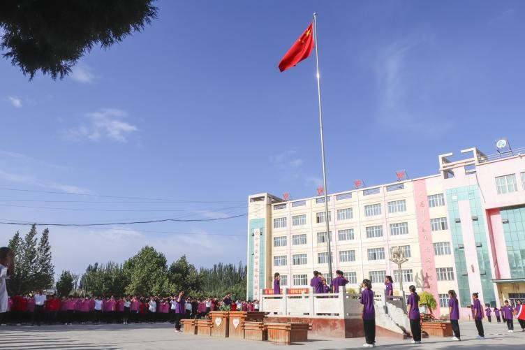 迎着朝阳,红柳中学升旗手迈着整齐划一、铿锵有力的步伐,昂首阔步护卫着国旗走向升旗台。当雄壮的国歌奏响,带队教师美合日姑丽、热米拉及16名实践队员,与红柳中学全校师生一起,向冉冉升起的五星红旗行注目礼、奏唱国歌。