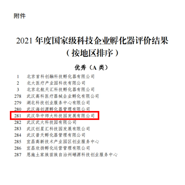 华大在线讯(通讯员 刘雯玉)12月28日,科技部火炬中心公布了国家级科技企业孵化器2021年度评价结果,武汉华中师大科技园发展有限公司(以下简称“华师科技园”)获评优秀(A类)等级。这是华师科技园自2016年3月被科技部评审认定为“国家级科技企业孵化器”以来,连续6年被评为优秀(A类)等级,全国共有386家国家级科技企业孵化器获此殊荣。