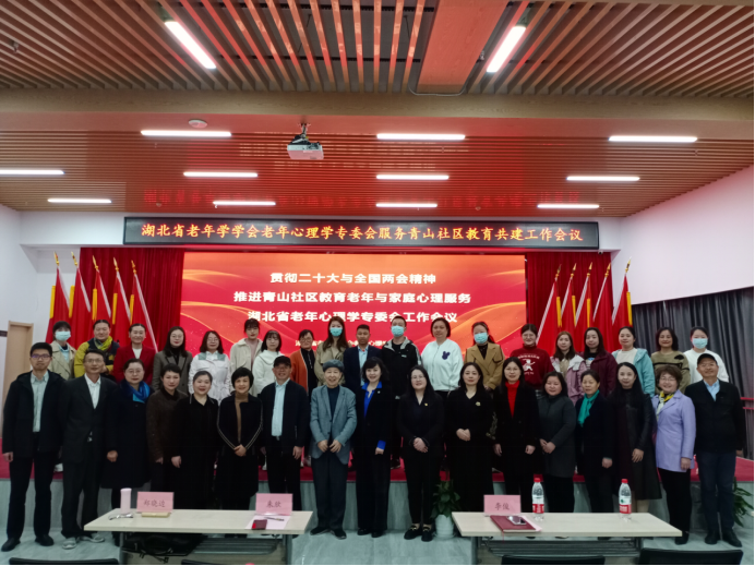 华大在线讯(通讯员 方潇)为进一步深入学习贯彻党的二十大与全国两会精神,推进社会心理服务体系建设,关注社区老年人与家庭的健康发展,3月16日,“贯彻二十大与全国两会精神,推进青山社区教育和老年与家庭心理服务”湖北省老年心理学专委会工作会议在武汉市青山区绿景苑党群服务中心举行。我校心理学院退休教授、湖北省老年学学会副会长、老年心理学专委会主任郑晓边,心理学院副教授王忠军,博士研究生杨晓梦作专题报告。