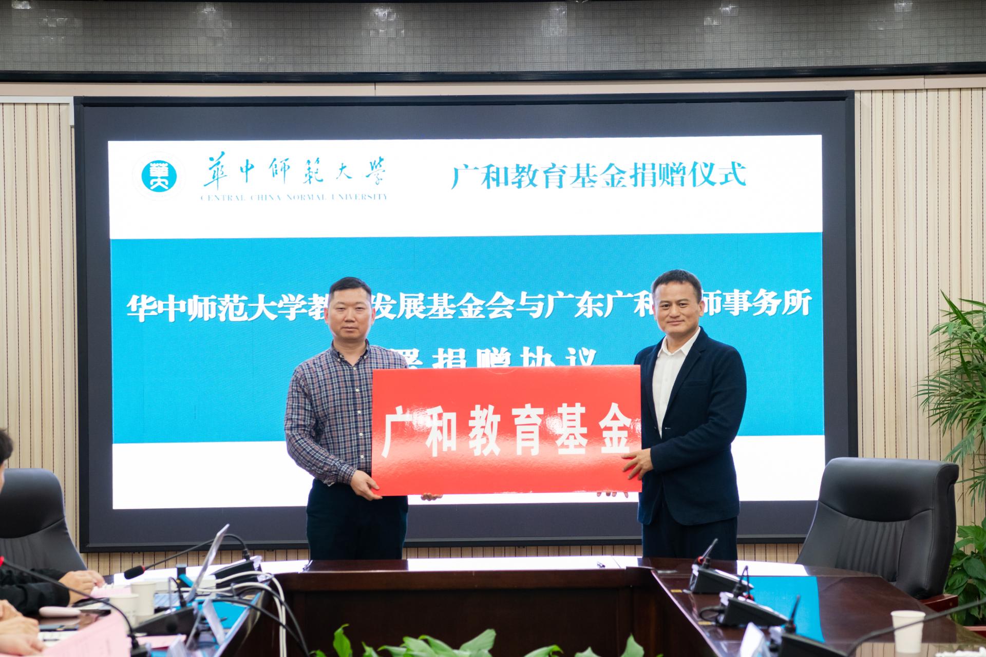华大在线讯(通讯员 吴国栋 徐静宜 )4月3日,广和教育基金捐赠仪式在行政楼一楼会议室举行。校党委书记夏立新、广东广和律师事务所首席合伙人童新出席,学校教育发展基金会、法学院和广和律师事务所相关负责同志以及师生代表参加。