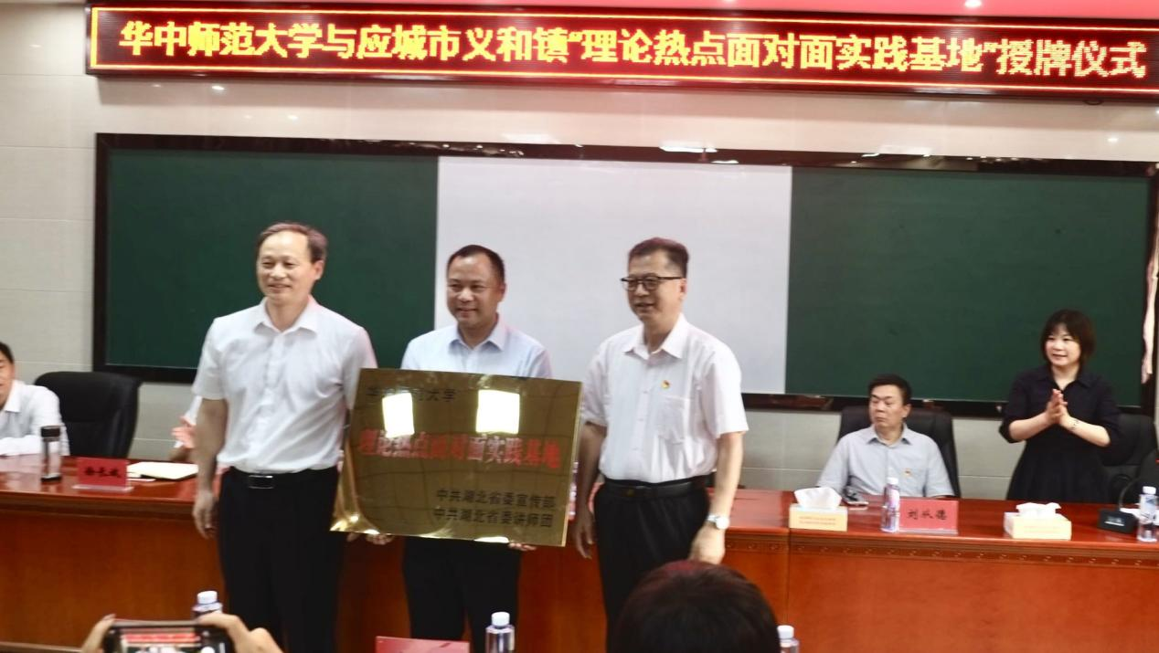 华大在线讯(通讯员 卞亚琴 胡尉尉 宋玉麒)6月10日,华中师范大学“理论热点面对面实践基地”授牌仪式在应城市义和镇举行。湖北省委讲师团主任高天琼、我校副校长彭南生、应城市委书记徐长斌、孝感市委宣传部副部长胡光辉,应城市委常委、宣传部长李艳霞出席授牌仪式。