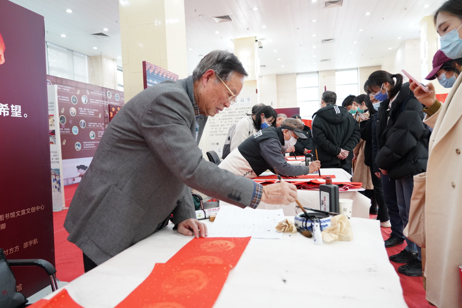 据介绍,本次中国年文化系列活动包括“中国年文化展”、年俗主题书展、“芸窗共读”讲座、“我为华师写对联”“飞贴送福”、汉服年文化拜年礼表演、“和李白对诗”“书香游园会”猜灯谜等活动,旨在展示传承中国传统年文化、携同书香共迎新春。其中,中国年文化展分别在图书馆主馆一楼大厅和南湖分馆展出,展览时间持续至2022年3月。