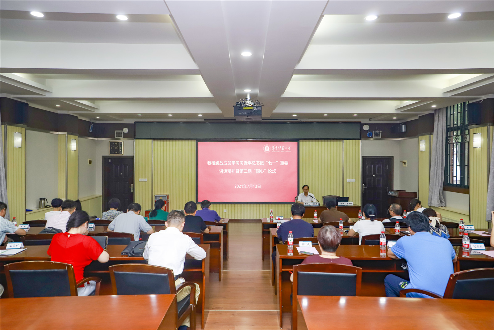 华大在线讯(记者 郝日虹)7月13日,我校统战成员学习习近平总书记“七一”重要讲话精神暨第二期“同心”论坛在行政楼二楼会议室举行。校党委副书记查道林以《为实现下一个百年奋斗目标 为中华民族伟大复兴凝聚智慧和力量》为题,为我校统战成员宣讲习近平总书记“七一”重要讲话精神。本次活动由党委统战部主要负责人主持。