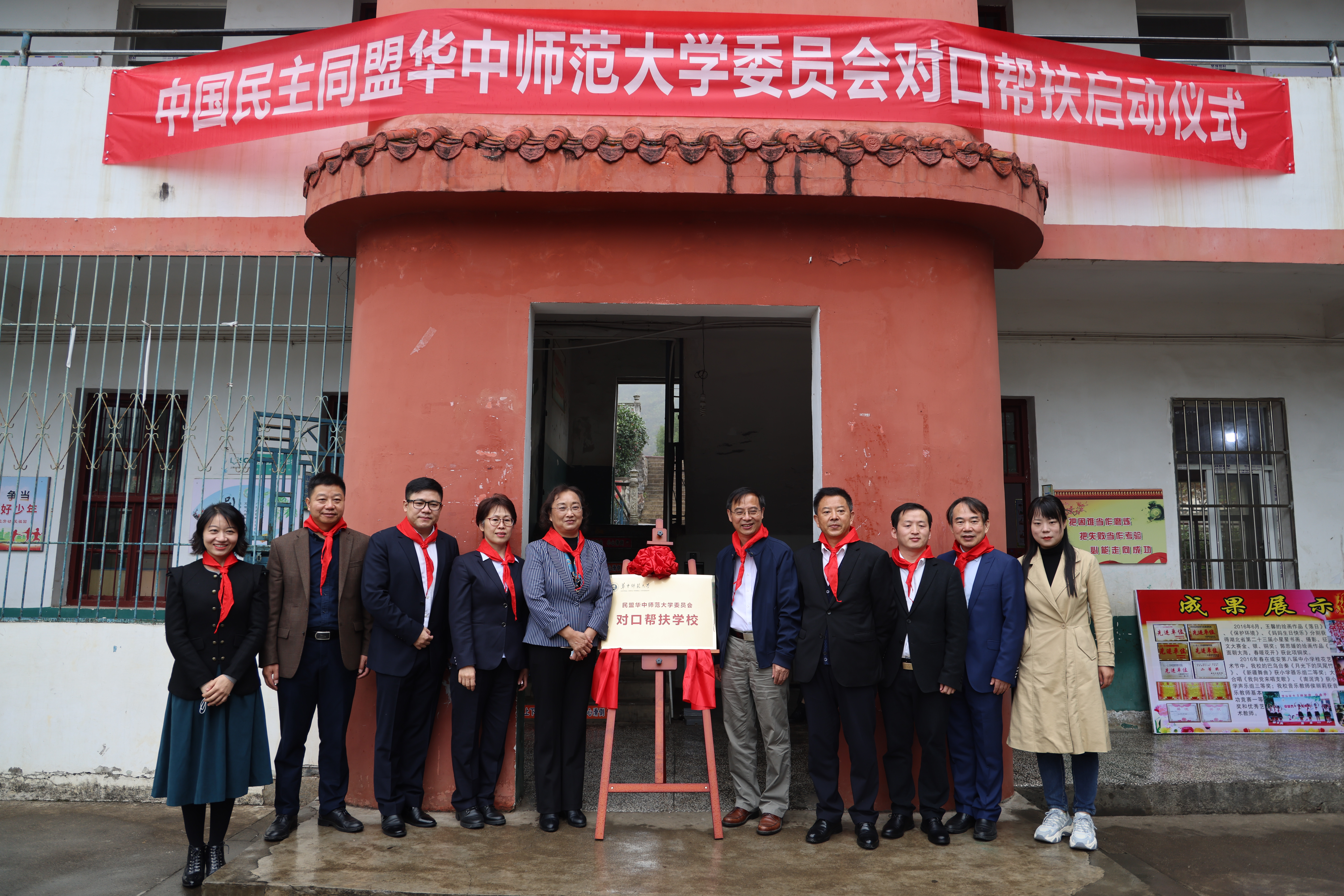 华大在线讯(通讯员 赵肖雄)11月5日,民盟华师委员会主办的教育对口帮扶活动在咸宁市咸安区大幕乡金鸡山小学启动。湖北省政协副秘书长、民盟湖北省委会专职副主委朱梅,校党委副书记查道林,咸宁市副市长、民盟咸宁市委主委刘复兴共同为“民盟华中师范大学委员会对口帮扶学校”揭牌。咸宁市政府副秘书长廖朝晖、咸安区委书记顾兴旺、我校党委统战部主要负责人、民盟华师委员会骨干盟员代表、企业代表参加启动仪式。