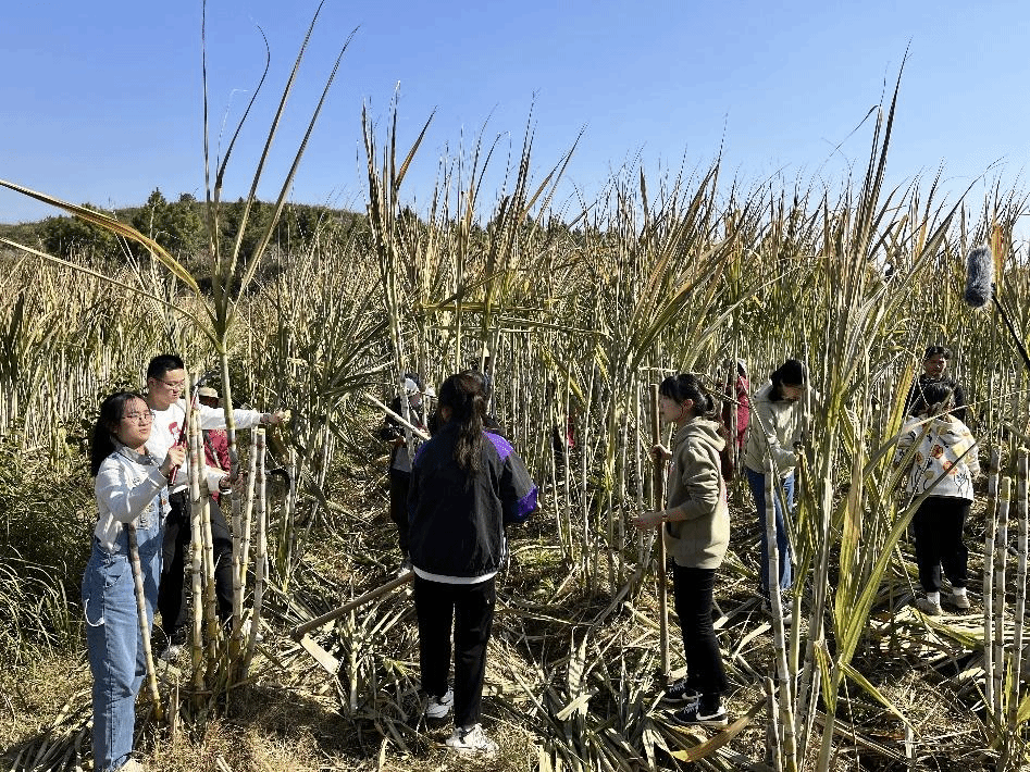 本次社会实践活动共分为砍运糖蔗、糖蔗榨汁、古法熬糖、制作红糖、直播助农等5个环节。同学们抵达小镇后,在当地农户指导下,立即投身到糖蔗收割活动中来。大家挥舞镰刀、挥动锄头,相互合作,动作逐渐由生涩转为熟练,田间垅头充满着相互鼓劲的声音。经历一个余小时的砍割糖蔗后,同学们不顾疲惫,帮助农户整理糖蔗并打捆,使用推车等工具将数百条糖蔗运回车间,深入体验榨汁环节。