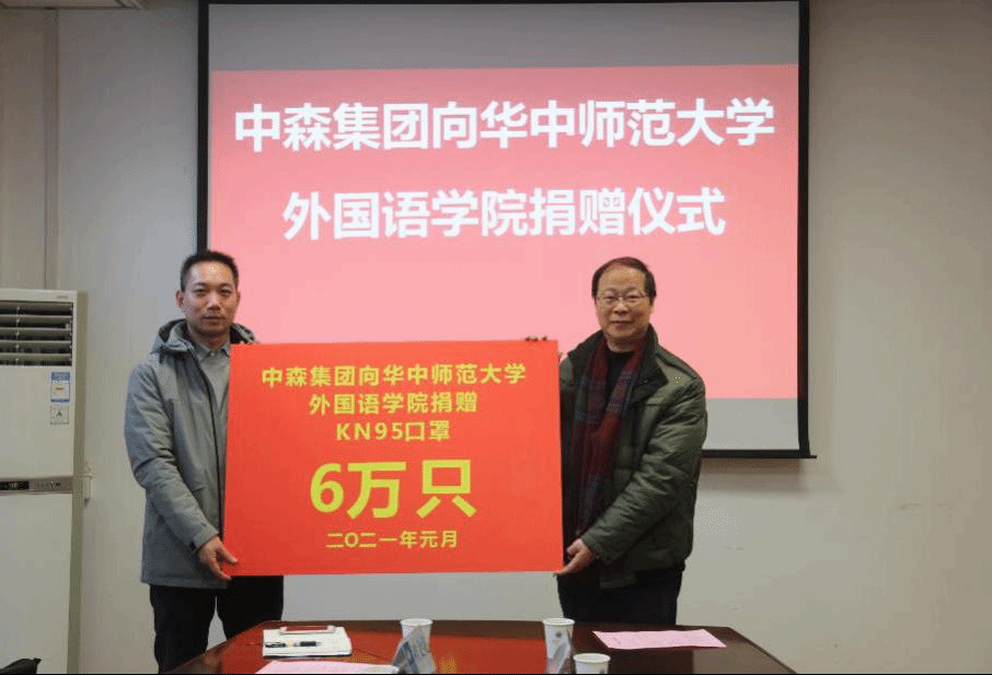 华大在线讯(通讯员 外轩)1月4日,武汉中森集团KN95口罩捐赠仪式在外国语学院二楼会议室举行。武汉中森集团副总裁李志高,校党委副书记、纪委书记陈厚丰,中森医疗总经理李旭东,中森医疗副总经理张文俊出席。学校办公室、校友工作与合作发展办公室、国有资产管理办公室、外国语学院等相关单位负责人以及学生代表参加。