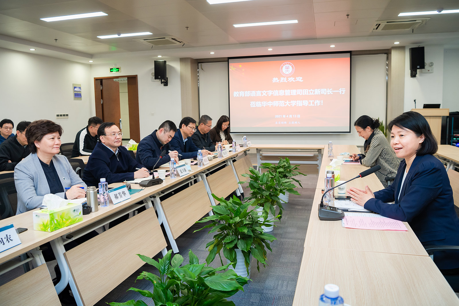 华大在线讯(记者 郝日虹 见习记者 熊娟 苏高月)4月13日,教育部语言文字信息管理司司长田立新、湖北省语委办主任戴明一行来校开展专题调研,在南湖综合楼计算机学院7119会议室与校长郝芳华、副校长夏立新、国家语言资源监测与研究网络媒体中心学术委员会主任李向农以及计算机学院党政领导班子座谈。人事部、社科处、研究生院、文学院、语言研究所等相关单位负责人、国家语言资源监测与研究网络媒体中心全体研究人员参加。座谈会由夏立新主持。