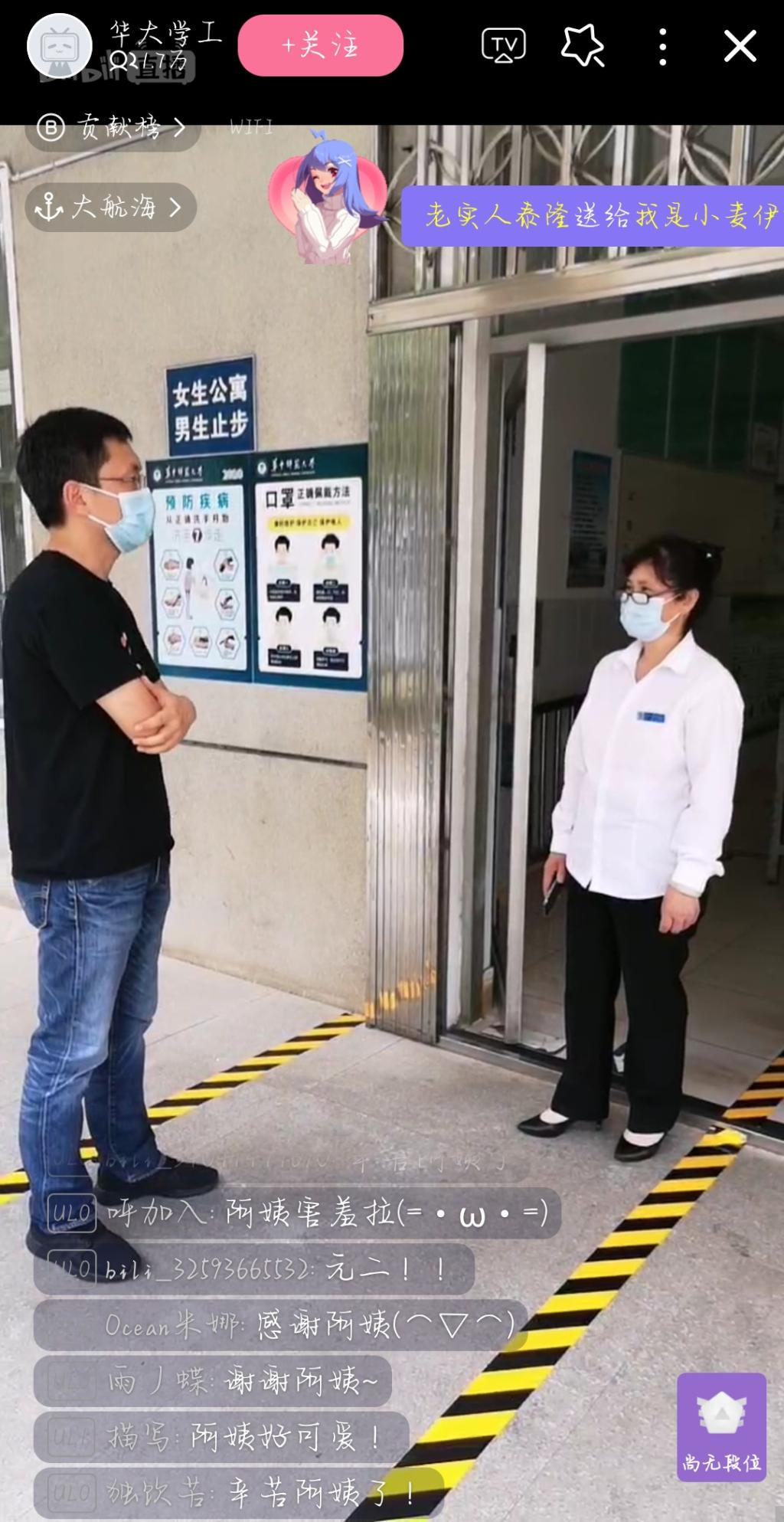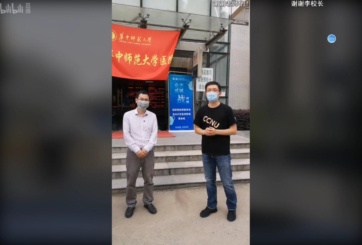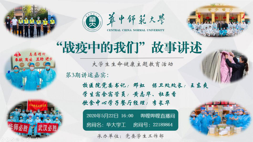 华大在线讯(通讯员 张韵洁 田舒琪)5月22日下午4时,我校大学生生命健康主题教育“战疫中的我们”故事讲述活动第三期在哔哩哔哩直播间举行,党委学生工作部副部长李刁担任主播。本期讲述活动中,副校长任友洲、李鸿飞,校医院党委书记邓虹,保卫处处长王东爽、学生宿舍宿管员黄志华、杜丕香,饮食中心学子餐厅经理李长华应邀分享守护校园的故事。全体本科生、研究生在线观看。
