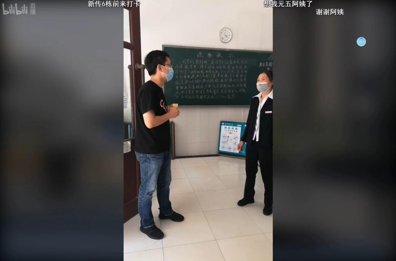 场景变换,主播乘坐校车路过佑铭体育场,久违的“爱心树”映入眼帘。沿路来到了东区二栋宿舍,东二宿管员杜丕香讲述了宿管阿姨帮助同学们晒被子的故事。杜阿姨表示,对同学们的需求,都会尽自己最大的努力达到。同学们纷纷用弹幕刷屏:“阿姨辛苦了”。