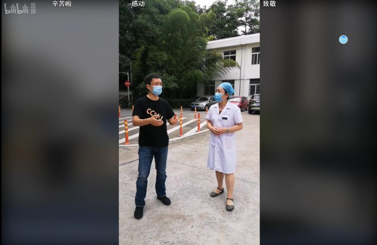 主播来到校医院,对校医院党委书记邓虹进行采访。邓虹表示,防疫初期,校医院快速地备齐了防疫物资,并于1月23日封城之前发放给了留校师生。校医院不仅承担着校内的防疫抗疫任务,还对接校内外3个隔离点,为社会提供支持。在采访过程中,邓虹还介绍了许多校医院医护人员在疫情防控工作中的感人事迹。此时,镜头转向了校医院门口挂起的“华中师范大学医院”的院旗,邓虹感慨道:“这面旗帜感召着校医院的每位工作者,激励我们用行动践行初心。”