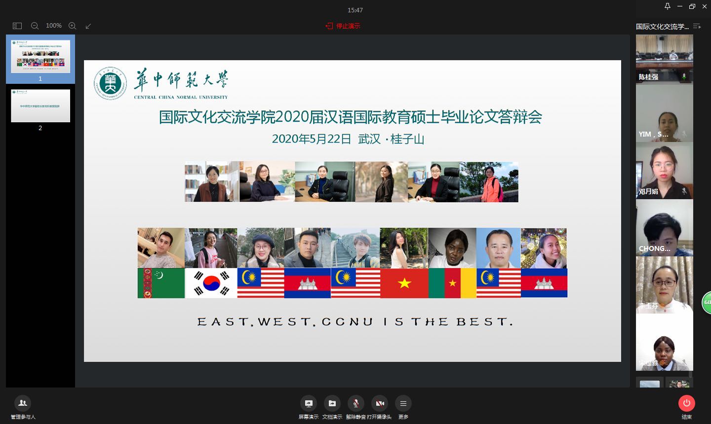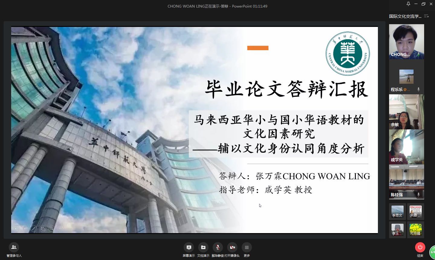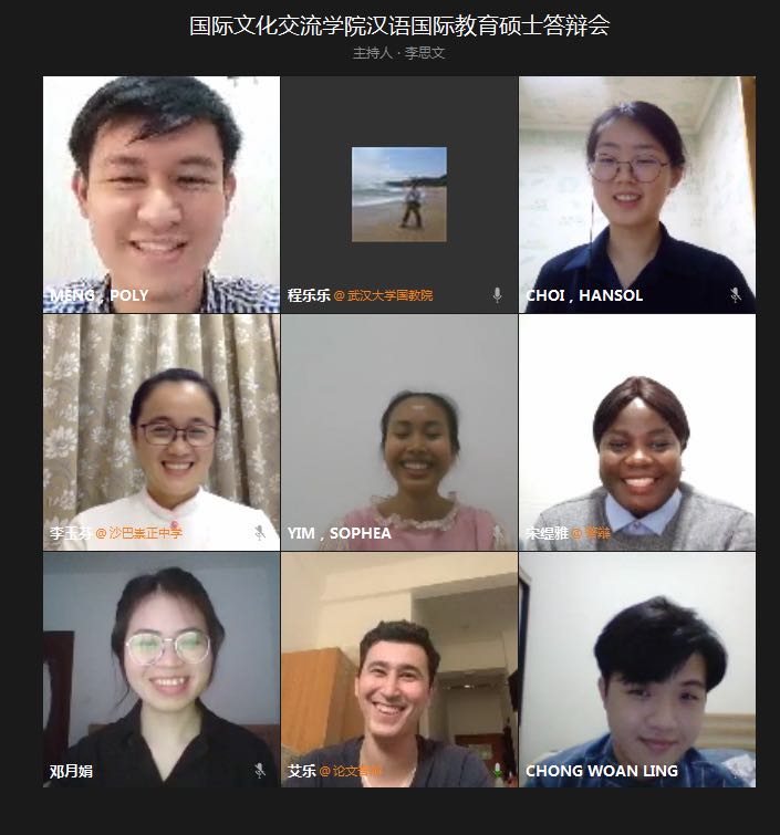 华大在线讯(通讯员 李思文)5月22日下午,国际文化交流学院2020届汉语国际教育硕士毕业论文答辩会通过企业微信视频会议举行。来自越南、柬埔寨、韩国、马来西亚、喀麦隆、土库曼斯坦6个国家的9名国际学生参加本次答辩会。副校长彭双阶应邀出席。答辩会由国际文化交流学院院长佐斌主持。