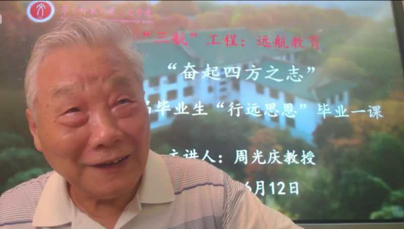 华大在线讯(通讯员 李哲立 孟霞 镇熙宇)6月12日,由华中师范大学关心下一代工作委员会、文学院主办的“三航”工程之远航教育暨2020届毕业生“行远思恩”毕业一课在哔哩哔哩平台举行。我校语言与语言教育研究中心原研究员周光庆教授为文学院全体本研毕业生做了主题为“奋起四方之志”的主题报告。离退休工作处、关工委、党委学生工作部、党委研究生工作部、文学院等相关单位负责人出席。
