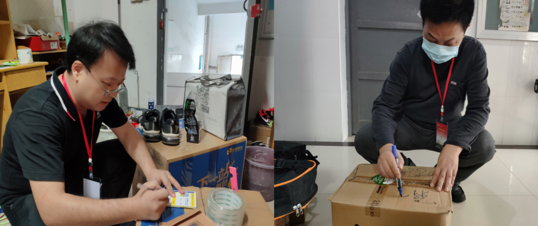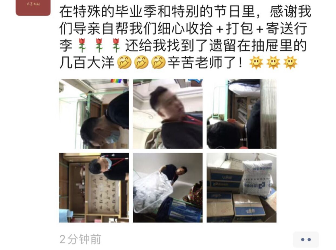 为保障不返校毕业生的行李安全,学院发动全体老师打包行李。每名毕业生都安排了一名宿舍责任导师,通过“一对一”沟通,统计每个人的邮寄地址与个性需求。清理物品、整理打包、行李封箱……学生宿舍里,老师们通过现场视频、电话连线等方式,与学生确认行李打包信息,叠好一件件衣裳,清好一本本书籍,贵重物品单独邮寄,纸箱打包好后再仔细地写上托运物品信息。每天从早八点到晚八点,从南湖到桂子山,从南湖六栋到东区十六栋再到国交四栋,老师们打包寄送的不仅是同学们的行李,也是一份爱和浓浓的师生情谊。