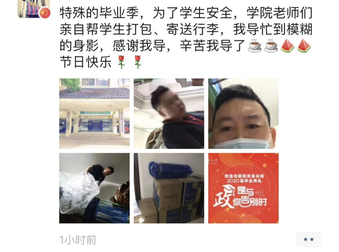 华大在线讯(通讯员 骆婉婷 赵云龙)6月21日清晨,南湖宿舍区,一支由政治与国际关系学院全体导师及行政管理人员组成的35人教师志愿者服务队正在开展一场“行李大作战”,为因疫情无法返校的150余名毕业生打包行李。这堂历时两天、由老师们身体力行“讲授”的生动的思想政治教育课,让毕业生们很暖心。