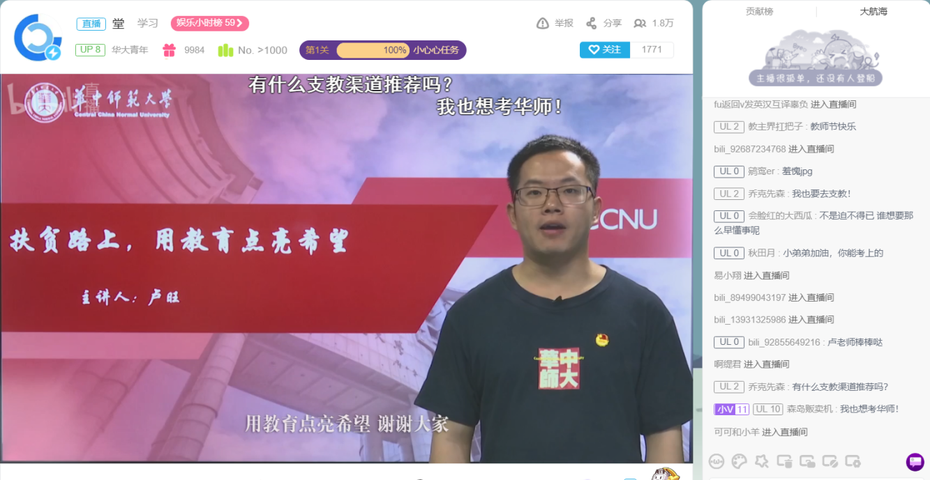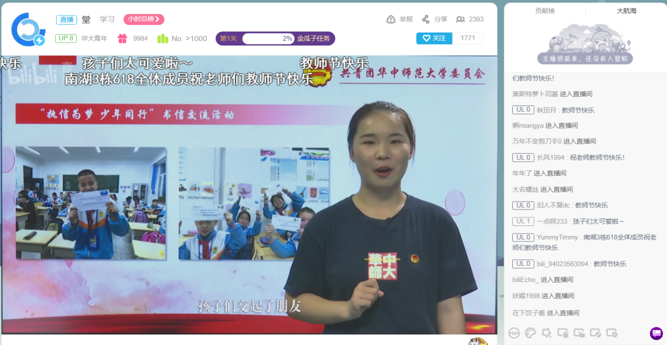 9月10日10:00,主题宣讲在华大青年“哔哩哔哩”直播间正式开始。曾在新疆兵团第五师、云南省牟定县和湖北省建始县支教的三位主讲人分别从华师特色育人项目、教育扶贫和关爱留守儿童三个角度出发,讲述自己支教的经历和故事。