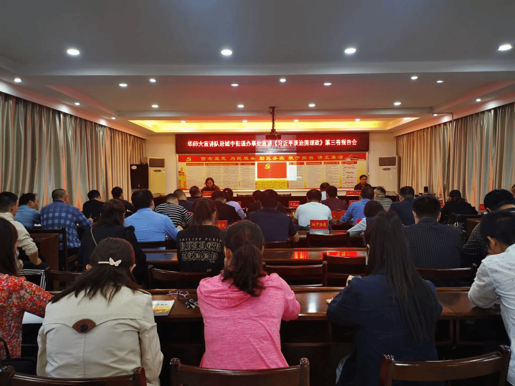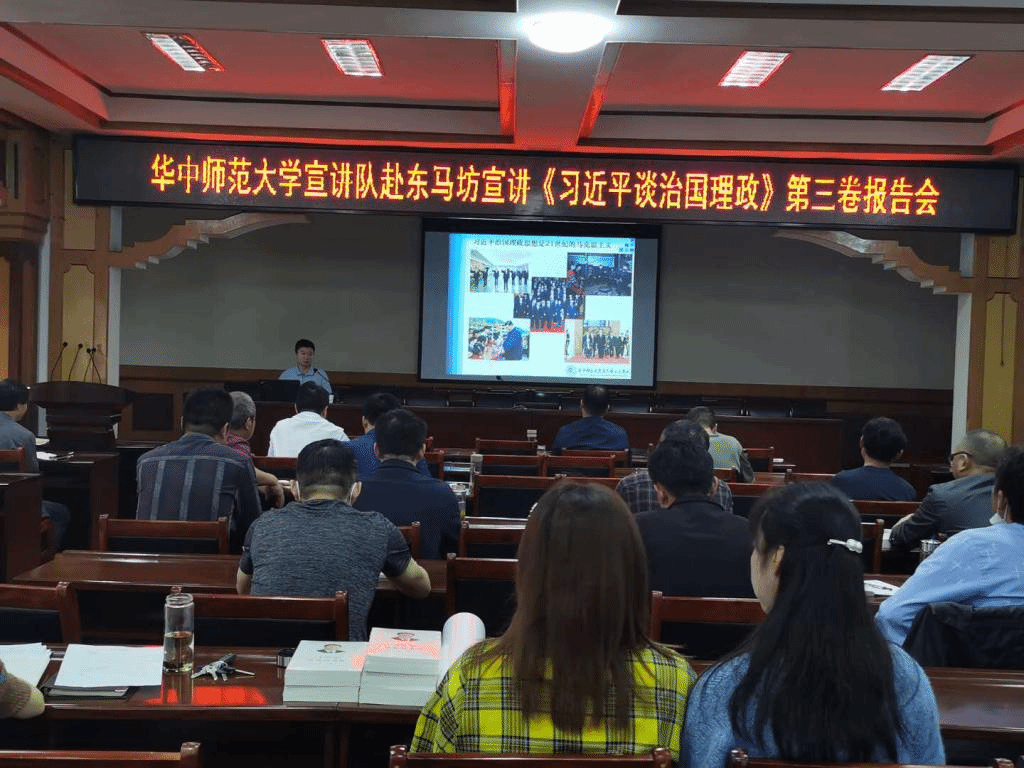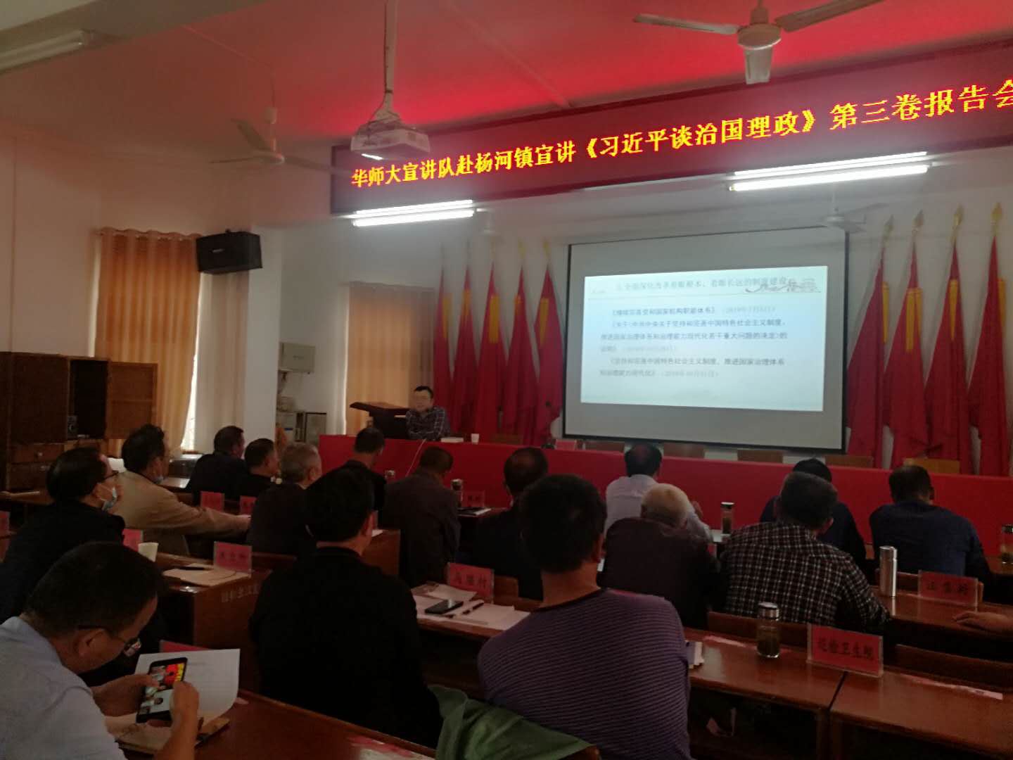 华大在线讯(通讯员 杨芳芳 马珺)为深入贯彻落实习近平新时代中国特色社会主义精神,用思想武装头脑,指导工作,根据省委宣传部、省委讲师团的工作部署,9月25日,我校“理论热点面对面示范点”专家宣讲团成员深入应城各地,在城中街道办事处、汤池镇、黄滩镇、东马坊街道办事处、杨河镇进行了马克思主义中国化的最新理论成果《习近平谈治国理政》第三卷宣讲。