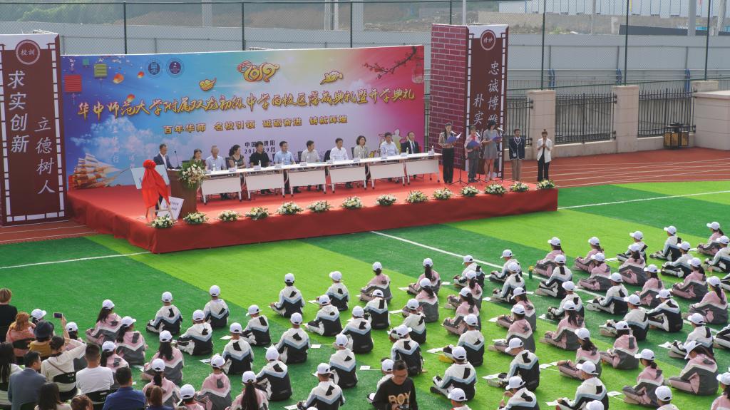 华中师范大学附属双龙初级中学是由贵州双龙航空港经济区、华中师范大学、贵阳首开龙泰房地产开发有限公司和耐一教育投资控股有限公司四方合作创办,旨在大力推进贵州双龙航空港经济区特色教育发展。学校座落于贵州省会贵阳市中心区贵州双龙航空港经济区机场路首开紫郡旁,社会经济活跃,地理区位优越,是一所为非营利性民办寄宿制初级中学,规模54个班2000人,这是该校建成后的首次开学典礼。