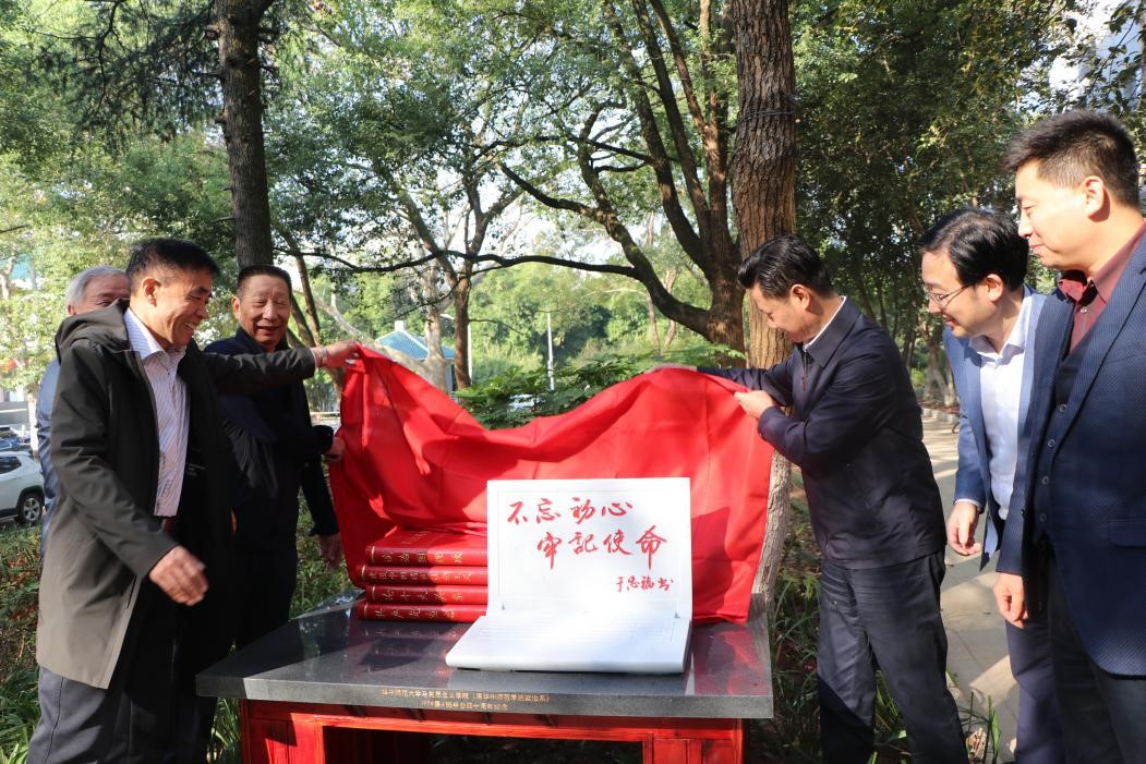 揭幕仪式上,校长、党委副书记赵凌云与校友工作与合作发展办公室主要负责人、马克思主义学院主要负责人、校友代表共同为1979届4班毕业生捐赠的附有《共产党宣言》等四本雕刻书的纪念石碑揭幕。碑上“不忘初心、牢记使命”由中国人民解放军空军政委于忠福上将题写。
