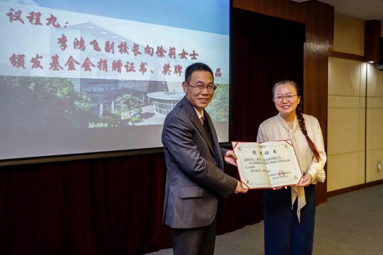 华大在线讯(通讯员 孟霞 刘汉骄)11月22日,“益利乐生”奖教学金捐赠仪式在逸夫国际会议中心二楼会议室举行。副校长李鸿飞为香港益利乐生教育基金有限公司董事会主席、汉鼎书院创校校监、文学院1985级校友徐莉颁发“特殊贡献奖”奖牌及捐赠证书;文学院党委书记朱庆海代表学院接受捐赠支票;学校教育发展基金会代表易吉林与徐莉签署捐赠协议。