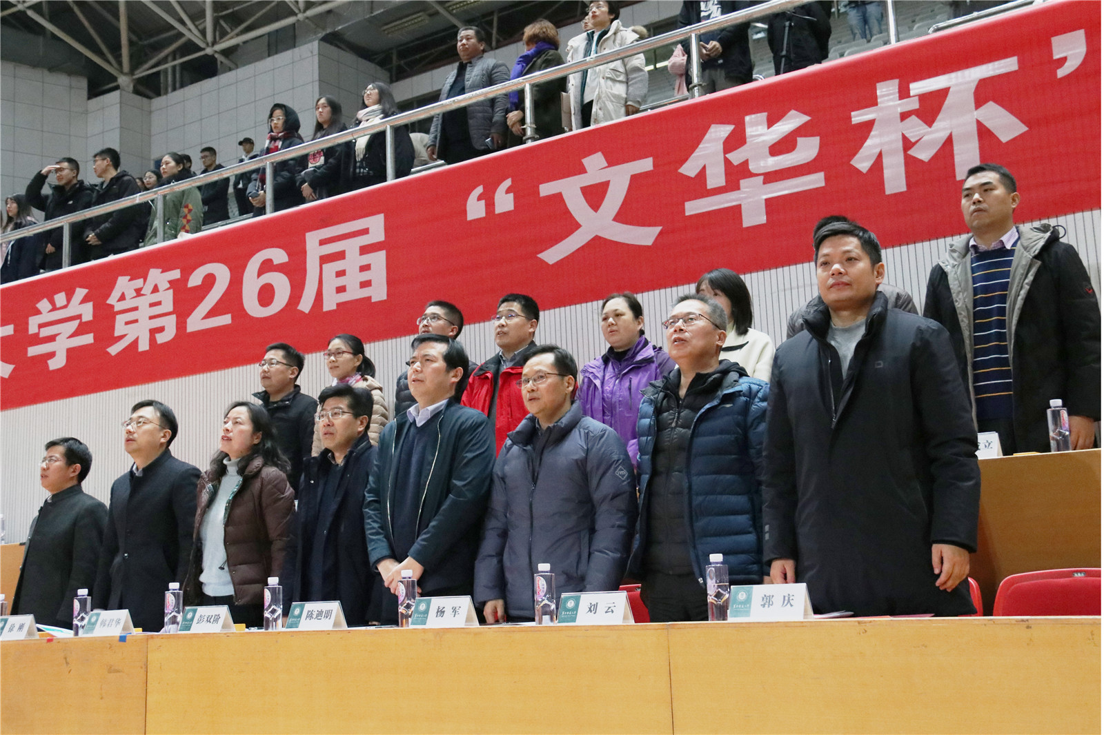 入场式完毕,全体起立奏唱国歌。升旗结束后,体育学院及文学院主要负责人为开幕式致辞。他们指出,文华杯规模大、历史久、人气高,吸收了华师百年历史文化养分,具有丰富的人文内涵,传递了青春气息和健康活力。他们希望同学们在比赛中充分发扬体育精神,加强团结、展示风采。