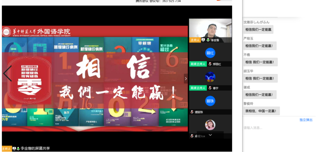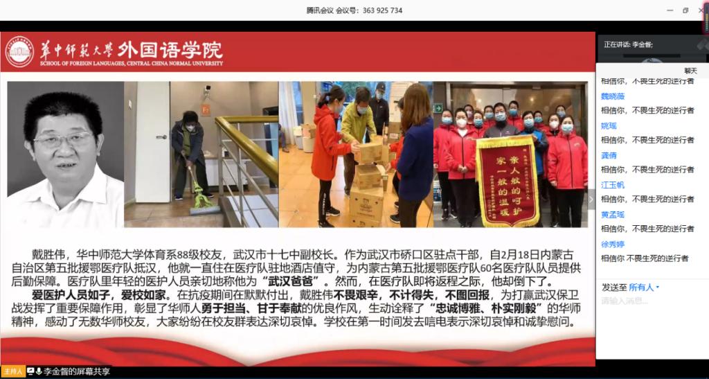 外国语学院研究生辅导员李金督担任本次主题教育示范课主讲人。他以《相信》为主题,分成“相信你,不畏生死的逆行者”“相信你,还未归家的战疫人”和“相信我们,新时代的新青年”三个板块,讲述了奋战抗疫一线的护士李婷、消杀防疫员于继斌、人民警察郑勇、雷神山建筑工人、“武汉爸爸”戴胜伟、“90后”护士李宇莲、我校外国语学院08级校友刘洁等在抗击疫情过程中的英雄人物和英雄事迹,带领同学们重温了抗疫过程中的感动与温情、担当与坚守,传达了抗击疫情的坚定决心以及“中国一定能赢”的信心。李金督还借用习近平总书记给北京大学援鄂医疗队全体“90后”党员的回信勉励同学们要不惧风雨、勇挑重担,让青春在党和人民最需要的地方绽放绚丽之花。