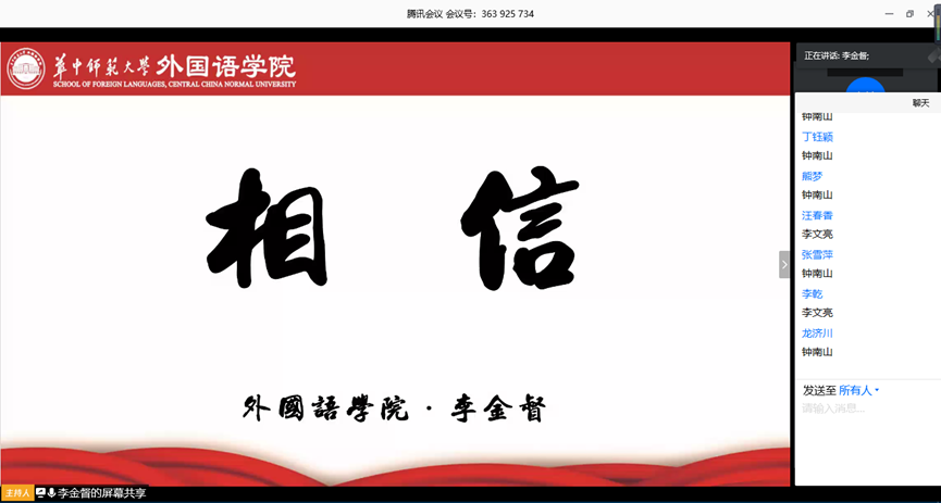 华大在线讯(通讯员 李金督 曾钰玲)4月12日晚,第三堂研究生“线上点名”主题教育示范课暨外国语学院2018级研究生晚点名主题教育活动举行。校党委书记赵凌云、副校长彭双阶,华师优秀校友、湖北省社科联党组成员、秘书长吴红斌以及来自北京师范大学、华东师范大学、东北师范大学、陕西师范大学、西南大学等多所高校的外语学院副书记、副院长应邀参加。