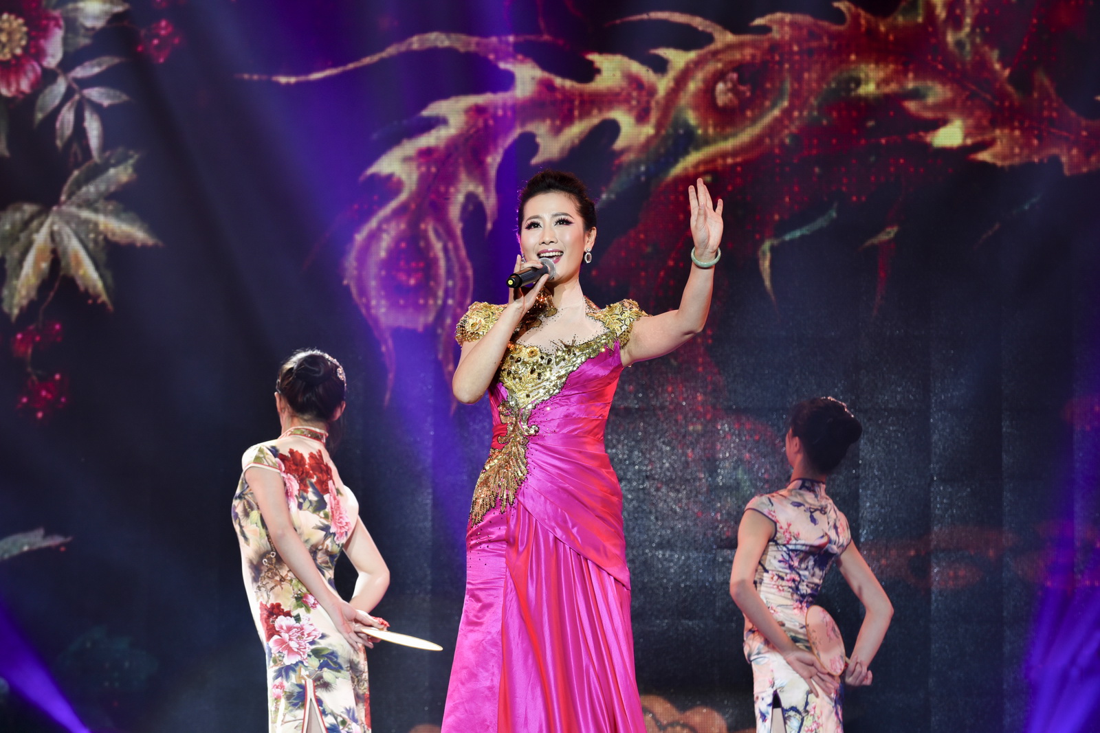 身着苗族服饰的舞蹈演员将万莉簇拥在舞台中央,“哎…… 哥在那彩云的南,妹在那彩云的北,好想和你嘴对嘴呀,山歌打对对”,一首《彩云之南》拉开演唱会的序幕。歌声绵长悠扬,转而又活泼奔放,展现出一幅青山绿水的美景。